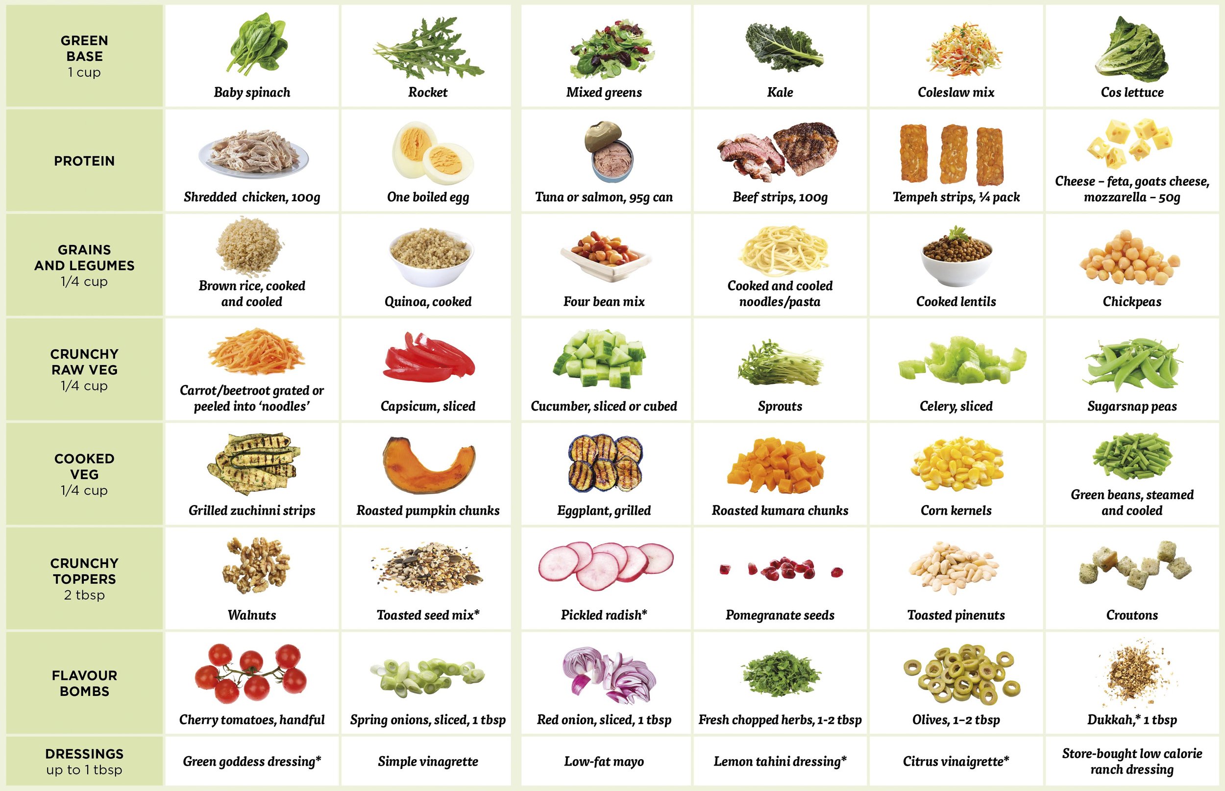 Love salads but need inspiration of what else goes in a salad besides the usual lettuce, cucumber, and tomatoes? We've created a pull-out guide so you can create the tastiest and most nutritious salads of the summer.