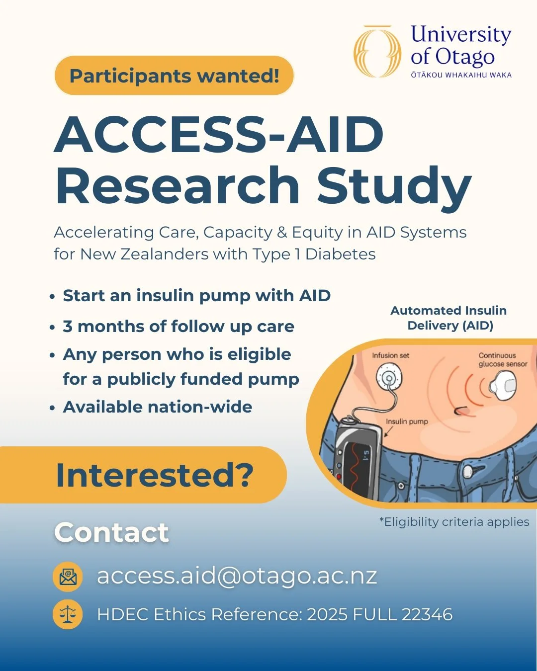 Participants will take part in an interview (45 – 60 minutes) and will receive a $50 gift voucher for their time. For further information, please email t1dproject@otago.ac.nz or sara.styles@otago.ac.nz before 5 January 2026.